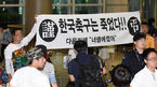 [OSEN=인천국제공항, 이대선 기자] 2014 브라질 월드컵 16강 진출에 실패한 홍명보호가 오는 30일 오전 인천국제공항을 통해 귀국했다. 입국장에 시민들이 '한국 축구는 죽었다'라는 현수막을 들고 서 있다. 홍명보 감독이 지휘하는