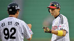 [OSEN=잠실, 이대선 기자] 2일 오후 서울 잠실야구장에서 '2014 한국야쿠르트 세븐 프로야구' LG 트윈스와 한화 이글스의 경기가 열렸다. 4회말 2사 2루에서 LG 김용의가 좌전 적시타를 치고 김민호 코치와 하이파이브를 하고 있다. L