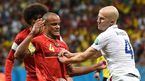 [OSEN=사진팀] 2일 오전(한국시간) 브라질 사우바도르 아레나 폰테 노바에서 열린 2014 브라질 월드컵 16강전 벨기에-미국 경기, 벨기에의 마루앙 펠라이니와 맷 배슬러와 공중볼 다툼을 하고 있다. 브라질 월드컵 8강행 티켓을 놓