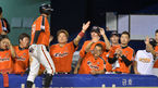 [OSEN=잠실, 이대선 기자] 3일 오후 서울 잠실야구장에서 '2014 한국야쿠르트 세븐 프로야구' LG 트윈스와 한화 이글스의 경기가 열렸다. 7회초 1사 1루에서 한화 정근우가 좌중월 투런 홈런을 치고 홈에서 강석천 코치와 하이파이