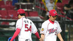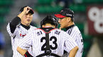 [OSEN=잠실, 김경섭 기자] 3일 오후 서울 잠실야구장에서 '2014 한국야쿠르트 세븐 프로야구' LG 트윈스와 한화 이글스의 경기가 열렸다. 6회초 1사 주자 1루 LG 우규민이 한화 김태균을 땅볼로 돌려세운마운드를 방문한 강상수 코치
