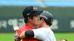 [OSEN=사직,박준형 기자] 7일 오후 부산 사직구장에서 열린 2014 한국야쿠르트 세븐 프로야구 롯데 자이언츠와 SK 와이번스의 경기전 부상 복귀한 SK 최정이 롯데 손아섭과 포옹을 하고 있다 위닝시리즈를 확정지은 롯데는 좌완 쉐