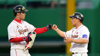 [OSEN=인천, 백승철 기자] 10일 오후 인천 문학구장에서 열린 '2014 한국야쿠르트 세븐 프로야구' SK 와이번스와 KIA 타이거즈의 경기 3회말 1사 1,3루 이재원이 1타점 2루타를 치고 백재호 코치와 하이파이브를 하고 있다. KIA 김병현
