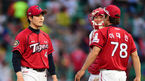 [OSEN=인천, 백승철 기자] 10일 오후 인천 문학구장에서 열린 '2014 한국야쿠르트 세븐 프로야구' SK 와이번스와 KIA 타이거즈의 경기 3회말 1사 1,3루 이재원에게 1타점 2루타를 허용한 김병현이 이대진 코치와 이야기를 나누고 있다.