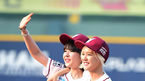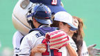 [OSEN=잠실, 최규한 기자] 11일 오후 서울 잠실야구장에서 '2014 한국야쿠르트 세븐 프로야구' 두산 베어스와 한화 이글스의 경기가 열렸다. 시구-시타자로 나선 그룹 립서비스 비파와 코라가 포수 최재훈을 끌어안고 있다. 선발로