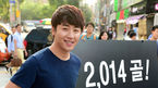 [OSEN=지형준 기자] 소아암 환아 치료비 모금 '슛포러브(Shoot for Love)' 행사가 11일 오후 서울 신촌 스타광장에서 열렸다. 홍진호가 페널티킥을 시도하고 있다. 이날 행사에는 전 프로게이머 홍진호, 만화가 김풍, 프로그래머 이두