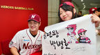 [OSEN=목동, 민경훈 기자] 12일 오후 서울 목동야구장에서 열린 '2014 한국야쿠르트 세븐 프로야구' 넥센 히어로즈와 NC 다이노스의 경기, 경기에 앞서 열린 박병호와 강정호의 팬 사인회에서 강정호가 여성팬에게 사인을 해 주고