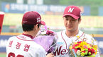 [OSEN=목동, 정송이 기자] 12일 오후 서울 목동야구장에서 '2014 한국야쿠르트 세븐 프로야구' 넥센 히어로즈와 NC 다이노스의 경기가 열렸다. 경기에 앞서 프로통산 67번째 100호 홈런을 달성한 넥센 이택근에게 넥센 염경엽 감독이