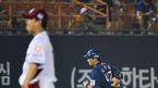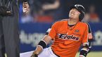 [OSEN=잠실,박준형 기자] 13일 오후 서울 잠실구장에서 열린 2014 한국야쿠르트 세븐 프로야구 두산 베어스와 한화 이글스의 경기 9회초 한화 선두타자 김태완이 자신의 파울타구에 맞은 후 고통스러워하고 있다. 이날 경기에서