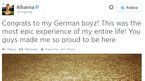 [OSEN=강필주 기자] 유명 가수 리한나가 2014 브라질 월드컵 우승팀 독일 대표팀에 축하인사를 보냈다. 독일은 14일 새벽 4시(이하 한국시간) 브라질 리우 데 자네이루 에스타디오 두 마라카낭에서 열린 2014 브라질 월드컵 결승전