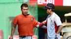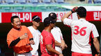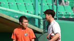 [OSEN=인천, 민경훈 기자] 16일 오후 인천 문학야구장에서 열린 '2014 한국야쿠르트 세븐 프로야구' SK 와이번스와 한화 이글스의 경기 전, 한화 정근우가 SK 김광현에게 선물을 주기 위해 그라운드로 걸어나올때 조인성이 물어보고
