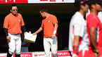 [OSEN=인천, 민경훈 기자] 16일 오후 인천 문학야구장에서 열린 '2014 한국야쿠르트 세븐 프로야구' SK 와이번스와 한화 이글스의 경기 전, 한화 조인성이 SK 타격 훈련때 찾아봐 인사를 하고 있다. 이 날 경기에서 SK와 한화는 각각