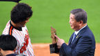 [OSEN=광주,박준형 기자] 18일 오후 광주 광주-기아 챔피언스 필드에서 열리는 '2014 한국야쿠르트 세븐 프로야구 올스타전' 웨스턴과 이스턴의 경기 박찬호가 KBO 구본능 총재에게 기념 트로피를 받고 있다. 이번 올스타전은 원년