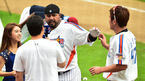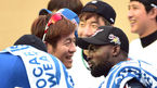 [OSEN=광주,박준형 기자] 18일 오후 광주 광주-기아 챔피언스 필드에서 열리는 '2014 한국야쿠르트 세븐 프로야구 올스타전', 홈런왕 행사에서 롯데 히메네스가 피에의 응원을 받고 있다. 이번 올스타전은 원년부터 33년간 명승부를