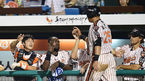 [OSEN=대전, 민경훈 기자] 24일 오후 대전 한밭야구장에서 열린 '2014 한국야쿠르트 세븐 프로야구' 한화 이글스와 NC 다이노스의 경기, 3회말 2사 주자 1,2루 한화 대타 조인성의 우익수 앞 역전 1타점 적시타때 홈을 밟은 최진행이