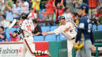 [OSEN=대전, 민경훈 기자] 24일 오후 대전 한밭야구장에서 열린 '2014 한국야쿠르트 세븐 프로야구' 한화 이글스와 NC 다이노스의 경기, 1회말 1사 주자 1,2루 한화 김태완이 중월 스리런 홈런을 날린 후 덕아웃에서 김태균과 하이파