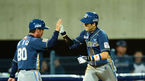 [OSEN=포항, 민경훈 기자] 25일 오후 포항 야구장에서 열린 '2014 한국야쿠르트 세븐 프로야구' 삼성 라이온즈와 NC 다이노스의 경기,6회초 2사 주자 1,2루 NC 박민우가 좌월 동점 스리런 홈런을 날린 후 홈에서 전준호 코치와 하이파