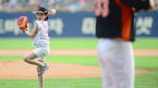 [OSEN=잠실, 김경섭 기자] 26일 오후 서울 잠실야구장에서 열린 '2014 한국야쿠르트 세븐 프로야구' LG 트윈스와 롯데 자이언츠의 경기, 경기에 앞서 진행된 시구에서 아역배우 이레가 시구를 하고 있다. LG는 사이드암 우규민을 선