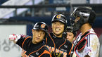 [OSEN=잠실, 지형준 기자] 27일 오후 서울 잠실야구장에서 '2014 한국야쿠르트 세븐 프로야구' LG 트윈스와 롯데 자이언츠의 경기가 열렸다. 연장 11회초 1사에서 롯데 황재균이 솔로포를 날리고 동료선수들과 하이파이브를 하고 있