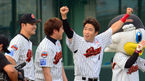[OSEN=부산,박준형 기자] 5일 오후 부산 사직구장에서 열린 '2014 한국야쿠르트 세븐 프로야구' 롯데 자이언츠와 NC 다이노스의 경기전 롯데 전준우가 김하늘과의 대결에서 승리후 환호하고 있다. 경기에 앞서 여자 골프계의 별과