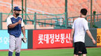 [OSEN=부산,박준형 기자] 5일 오후 부산 사직구장에서 열린 '2014 한국야쿠르트 세븐 프로야구' 롯데 자이언츠와 NC 다이노스의 경기에 앞서 옆구리 부상으로 결장중인 롯데 손아섭이 NC 테임즈와 이야기를 나누고 있다. 롯데는 4일