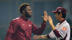 [OSEN=부산,박준형 기자] 5일 오후 부산 사직구장에서 열린 '2014 한국야쿠르트 세븐 프로야구' 롯데 자이언츠와 NC 다이노스의 경기전 니어핀 대결에서 프로골퍼 김하늘이 롯데 전준우에게 패한뒤 아쉬워하고 있다 경기에 앞서