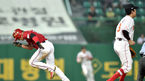 [OSEN=인천, 이대선 기자] 7일 오후 인천 문학야구장에서 '2014 한국야쿠르트 세븐 프로야구' SK 와이번스와 KIA 타이거즈의 경기가 열렸다. 5회말 무사 1,2루 SK 정상호의 번트때 송구 실책으로 실점을 허용한 KIA 토마스가 아쉬운 표
