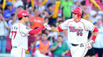 [OSEN=광주,박준형 기자] 10일 광주-기아 챔피언스필드에서 열리는 2014 한국야쿠르트 세븐 프로야구 KIA 타이거즈와 롯데 자이언츠의 경기, 1회말 1사 1루 KIA 필이 동점 홈런을 날린 후 김종국 코치와 하이파이브를 하고 있다. KIA는