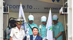[OSEN=인천, 민경훈 기자] 13일 오전 인천 중구 항동7가 인천항 제1부두에서 진행된 2014 인천 아시아 경기대회 해외 성화도착 환영식, 성화를 든 고경남 뉴골든브릿지 2호 선장이 최장현 위동항운사장에게 성화를 전달하고 있다.