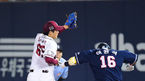 [OSEN=대전, 이대선 기자] 14일 오후 대전한밭야구장에서 '2014 한국야쿠르트 세븐 프로야구' 한화 이글스와 롯데 자이언츠의 경기가 열렸다. 3회말 1사 1,2루에서 한화 김태균이 자신의 타구가 발에 맞고 아웃되자 롯데 유먼이 병