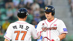 [OSEN=대전, 이대선 기자] 15일 오후 대전한밭야구장에서 '2014 한국야쿠르트 세븐 프로야구' 한화 이글스와 롯데 자이언츠의 경기가 열렸다. 3회말 2사 1,2루에서 한화 강경학이 우전 적시타를 치고 강석천 코치와 하이파이브를 하