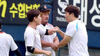 [OSEN=잠실, 최규한 기자] 17일 오후 서울 잠실구장에서 열리는 '2014 한국야쿠르트 세븐 프로야구' 두산 베어스와 롯데 자이언츠의 경기를 앞두고, 롯데 최준석-박준서와 두산 김현수가 인사를 나누고 있다. 두산과 롯데는 각각 유