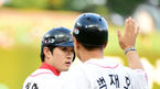 [OSEN=인천, 지형준 기자] 19일 오후 인천 문학야구장에서 열린 '2014 한국야쿠르트 세븐 프로야구' SK 와이번스와 두산 베어스의 경기, 2회초 2사 만루에서 두산 정수빈이 동점 1타점 좌전 적시타를 날리고 전상렬 코치와 주먹을 맞