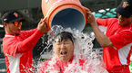 [OSEN=창원, 백승철 기자] 22일 오후 경남 창원 마산구장에서 열리는 '2014 한국야쿠르트 세븐 프로야구' NC 다이노스와 넥센 히어로즈의 경기 시작전 박병호가 아이스버킷챌린지에 동참하며 얼음물을 뒤집어 쓰고 있다. 허구연 해