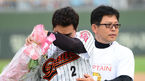 [OSEN=부산, 백승철 기자] 23일 오후 부산 사직구장에서 열린 '2014 한국야쿠르트 세븐 프로야구' 롯데 자이언츠와 LG 트윈스의 경기 시작전 조성환이 양상문 감독의 꽃다발을 받고 포옹을 하고 있다. 조성환은 이날 은퇴식을 갖는