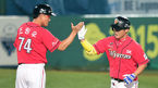 [OSEN=대구, 백승철 기자] 24일 오후 대구 시민구장에서 열린 '2014 한국야쿠르트 세븐 프로야구' 삼성 라이온즈와 SK 와이번스의 경기 8회초 2사 조동화가 솔로홈런을 치고 조원우 코치와 하이파이브를 하고 있다. 대구 삼성-SK전의