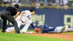 [OSEN=잠실, 지형준 기자] 24일 오후 서울 잠실야구장에서 열린 '2014 한국야쿠르트 세븐 프로야구' 두산 베어스와 NC 다이노스의 경기, 2회초 2사 1루에서 NC 김종호가 2루 도루에 실패하고 있다. 두산 2루수는 김재호. 이날 NC는 에릭