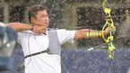 [OSEN=목동, 최규한 기자] 오는 9월 인천 아시아경기대회에 출전하는 양궁 국가대표팀이 26일 오후 목동야구장에서 넥센과 KIA의 2연전에 앞서 소음 및 관중 적응 훈련을 실시했다. 남자 양궁 오진혁이 장대비를 맞으며 활 시위를