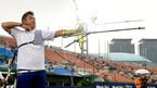 [OSEN=목동, 최규한 기자] 오는 9월 인천 아시아경기대회에 출전하는 양궁 국가대표팀이 26일 목동야구장에서 넥센과 KIA의 2연전에 앞서 소음 및 관중 적응 훈련을 실시했다. 남자 양궁대표 오진혁이 장대비 속에서 훈련을 진행
