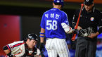 [OSEN=부산, 최규한 기자] 27일 오후 부산 사직구장에서 '2014 한국야쿠르트 세븐 프로야구' 롯데 자이언츠와 삼성 라이온즈의 경기가 열렸다. 3회초 삼성 공격 2사 1, 2루 상황 박해민의 파울 타구에 맞은 롯데 포수 강민호가 괴로운