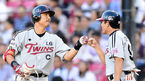 [OSEN=잠실, 곽영래 기자] 27일 오후 서울 잠실야구장에서 열린 '2014 한국야쿠르트 세븐 프로야구' 두산 베어스와 LG 트윈스의 경기, 1회초 2사 1,2루 LG 이진영이 1타점 적시타를 때린 뒤 김민호 코치와 하이파이브를 하고 있다. 두산