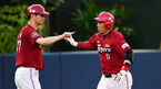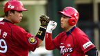 [OSEN=목동, 백승철 기자] 27일 오후 서울 목동구장에서 열린 '2014 한국야쿠르트 세븐 프로야구' 넥센 히어로즈와 KIA 타이거즈의 경기 1회초 1사 박기남이 솔로 홈런을 치고 김종국 코치와 하이파이브를 하고 있다. KIA 타이거즈 좌
