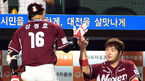 [OSEN=대전,손용호 기자] 28일 대전야구장에서 벌어진 '2014 한국 야쿠르트세븐 프로야구' 한화 이글스와 넥센 히어로즈의 경기,8회초 2사 1,2루 강정호가 스리런 홈런을 치고 박병호와 하이파이브를 하고 있다. 한화는 지난 22일 대