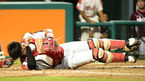 [OSEN=대전,손용호 기자] 28일 대전야구장에서 벌어진 '2014 한국 야쿠르트세븐 프로야구' 한화 이글스와 넥센 히어로즈의 경기,8회초 정범모가 문우람의 파울타구에 맞고 괴로워하고 있다. 한화는 지난 22일 대전 SK전 이태양(6⅔