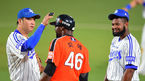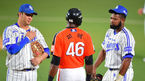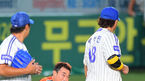 [OSEN=대구,박준형 기자] 4일 오후 대구구장에서 열린 2014 한국야쿠르트 세븐 프로야구 삼성 라이온스와 한화 이글스의 경기, 7회초 심판합의 판정때 삼성 채태인과 나바로가 1루 주자 피에와 이야기를 나누고 있다 올 시즌 상대