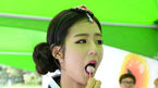 [OSEN=부산, 정송이 기자] 9일 오후 부산 사직구장에서 열린 '2014 한국야쿠르트 세븐 프로야구' 롯데 자이언츠와 SK 와이번스의 경기에 앞서 롯데 치어리더 박기량이 송편을 먹고 있다. SK 와이번스는 좌완 에이스 김광현 대신 문