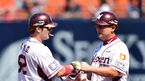 [OSEN=목동, 이대선 기자] 10일 오후 서울 목동야구장에서 '2014 한국야쿠르트 세븐 프로야구' 넥센 히어로즈와 한화 이글스의 경기가 열렸다. 2회말 무사에서 넥센 박병호가 중전 2루타를 치고 심재학 코치와 하이파이브를 하고 있