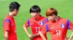 [OSEN=파주,박준형 기자] 11일 경기도 파주 NFC(국가대표축구트레이닝센터)에서 진행된 한국 아시안게임 축구대표팀 포토데이 행사에서 김승대가 기멍미, 전미경과 이야기를 나누고 있다 한국 남자축구는 이번 인천아시안게임에