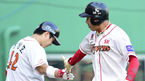 [OSEN=문학, 김경섭 기자] 13일 오후 인천 문학구장에서 열린 '2014 한국야쿠르트 세븐 프로야구 SK 와이번스와 NC 다이노스의 경기, 2회말 1사 주자 1,3루 SK 나주환의 적시타에 홈을 밟은 3루 주자 김강민이 정상호와 기쁨을 나누고