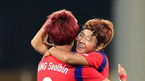 [OSEN=인천, 백승철 기자] 14일 오후 인천 남동 럭비경기장에서 열린 2014 인천 아시안게임 여자 축구 A조 1차전 한국과 태국의 경기 후반 유영아가 골을 넣고 정설빈과 포옹을 하고 있다. 윤덕여 감독은 지난 13일 열린 기자회견에